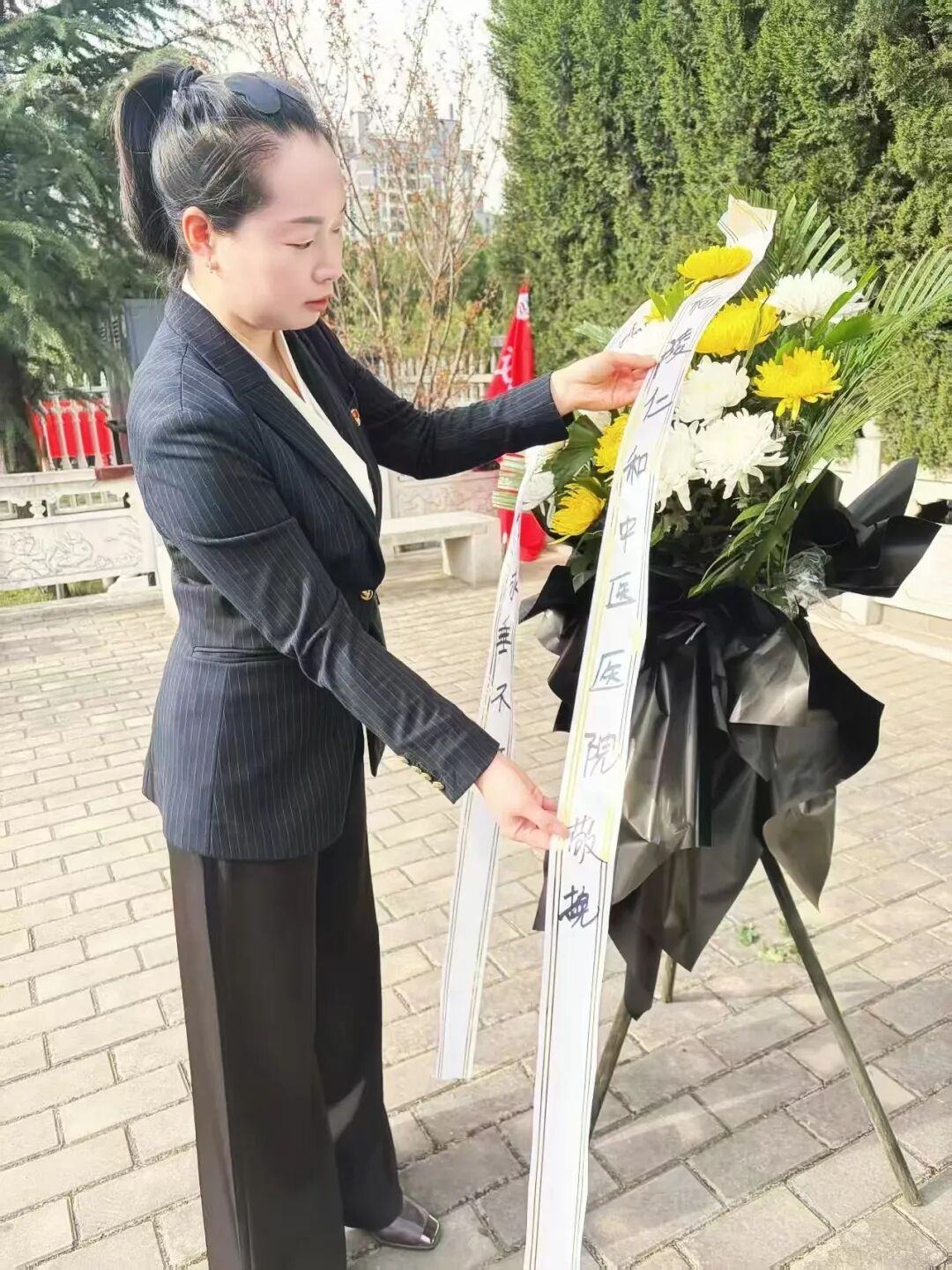 随后,我院党支部书记王亚娟同志上前整理挽联,动作庄重而轻柔,表达着对烈士们深深的敬意 !